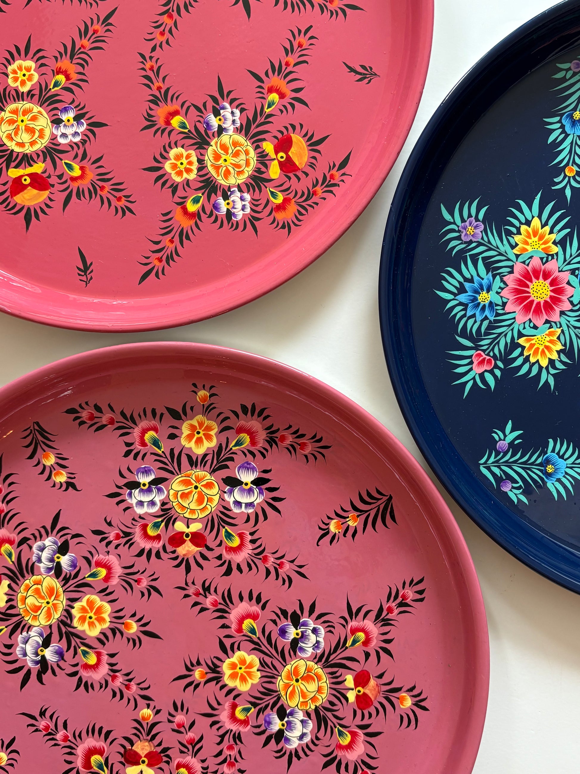 Met trots bieden we je een unieke collectie met de hand beschilderde metalen dienbladen aan, gemaakt door een familiebedrijf in het hart van Kasjmir. Hun vakmanschap wordt al generaties lang doorgegeven, en elk dienblad wordt zorgvuldig met de hand beschilderd met traditionele bloemmotieven en rijke, levendige kleuren.