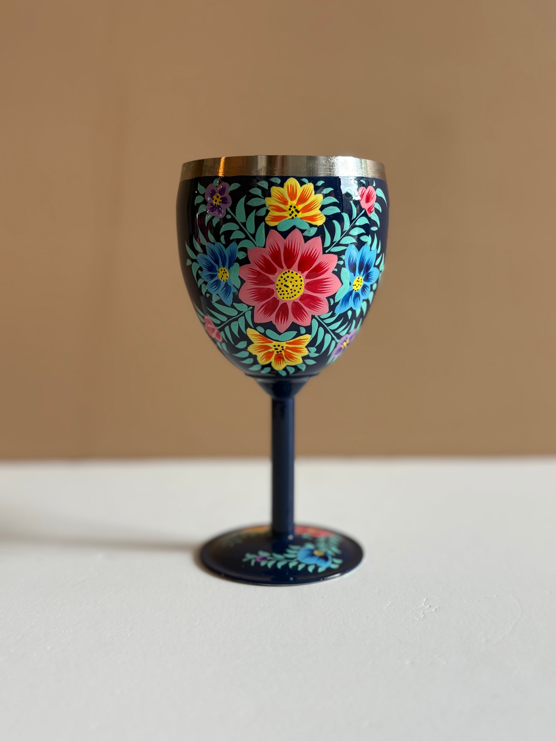 Even wat anders dan zo’n standaard glas. Breng wat extra kleur aan tafel met dit prachtige handbeschilderde wijnglas. Elk rvs glas is met zorg en vakmanschap gemaakt en versierd met vrolijke bloemenmotieven. Door het ambachtelijke schilderwerk is geen enkel glas hetzelfde.